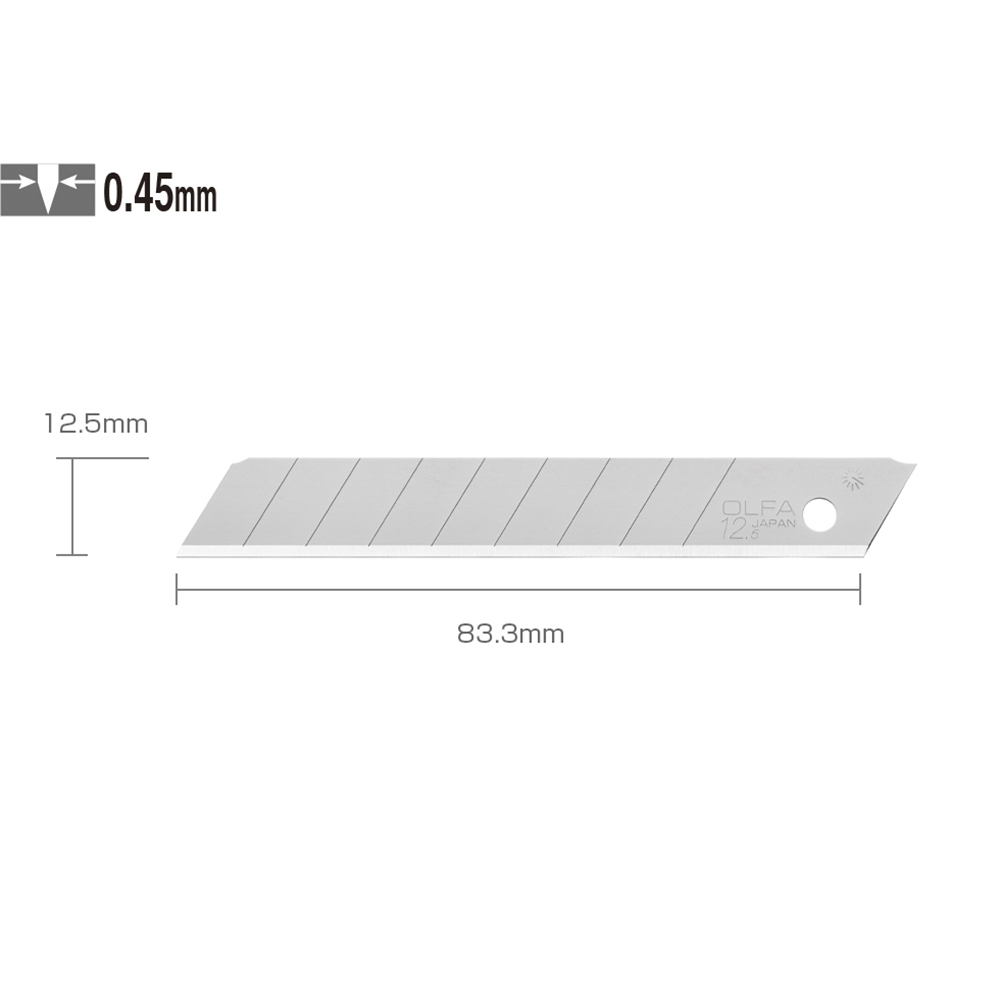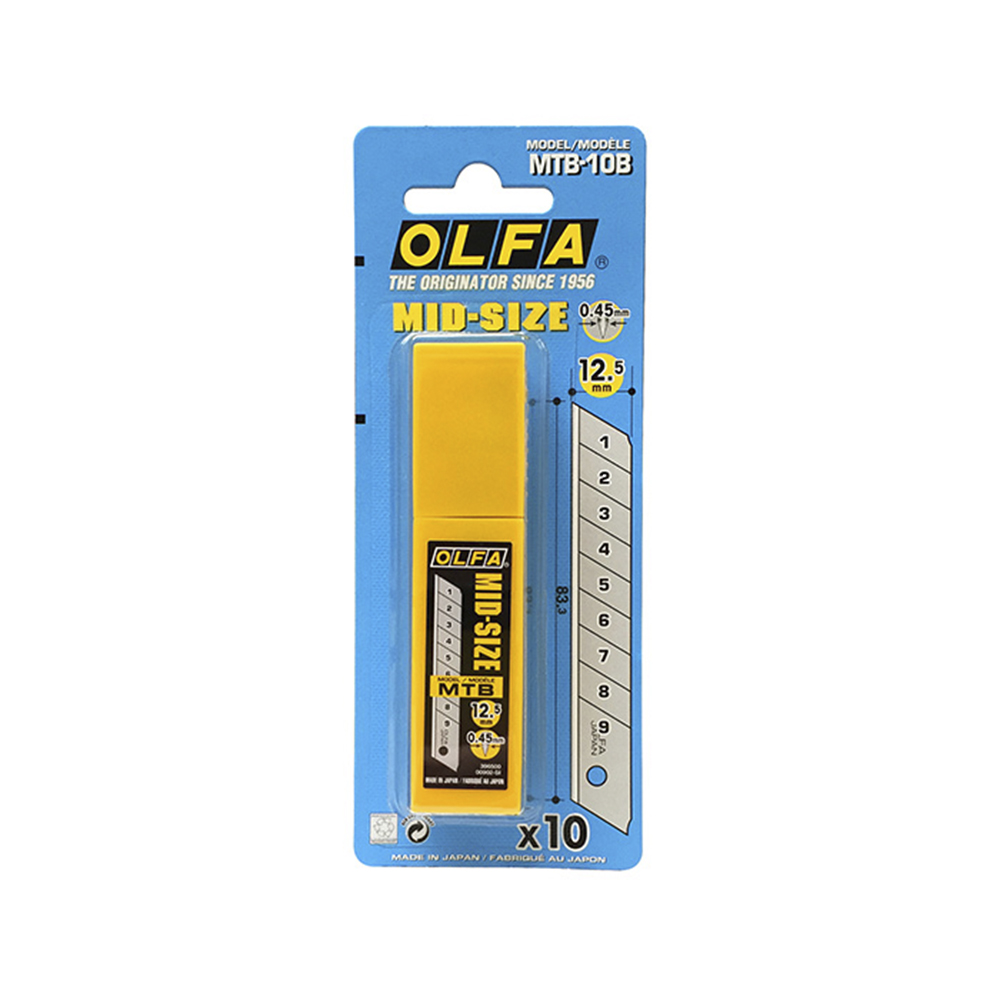 A lâmina destacável média, MTB, é compatível com o estilete MT-1. Possui 12,5 mm de altura e 0,45 mm de espessura. A OLFA possui uma grande variedade de lâminas que duram até 10x vezes mais. As lâminas OLFA são feitas de uma liga de aço especial para ferramentas. São muito afiadas e de grande vida útil. A qualidade superior das lâminas OLFA é resultado de um processo de produção exigente. Experiências e testes têm mostrado que o ângulo de 59 graus é o ângulo perfeito para uma lâmina destacável. Somente o aço da mais alta qualidade é selecionado para uso. Para todas as lâminas OLFA a resistência do aço é testada, os ângulos são afiados e as dimensões precisamente calculadas, entre outras condições. Tudo com a finalidade de alcançar o melhor balanço entre o afiamento de fábrica e a longevidade da lâmina. O ângulo, comprimento e largura das lâminas OLFA se tornaram padrão internacional para lâminas destacáveis.